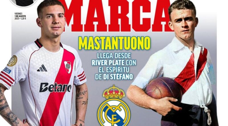En efecto, el influyente diario Marca le dedica la parte principal de su portada web, además de la tapa impresa de este viernes que muestra al nacido en Azul en la misma pose que Alfredo Di Stéfano, uno de los más grandes ídolos de la historia Merengue y que también fue enorme figura en River.