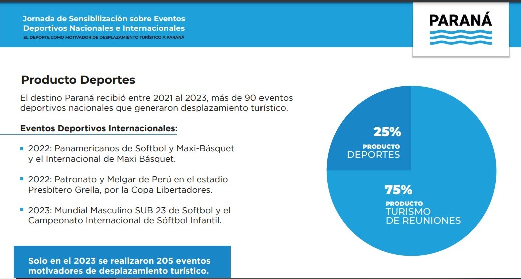 Según datos relevados, solo en el 2023 en Paraná se realizaron 205 eventos motivadores de desplazamiento turístico. De todos ellos, el 25 por ciento fueron generados por el producto deporte (denominación a eventos que generan la llegada de visitantes a la ciudad).