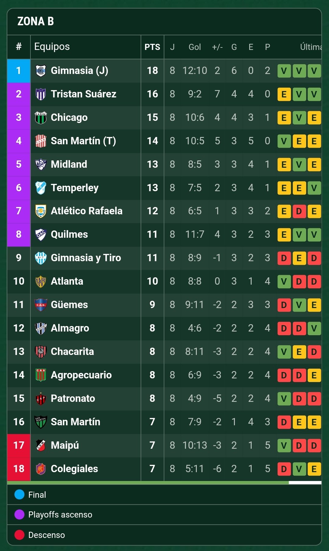Con estos resultados, Patronato cerró la jornada en el puesto 15 de la zona B con 8 unidades, a tan solo un punto de San Martín de San Juan, Deportivo Maipú y Colegiales, los últimos en la tabla.